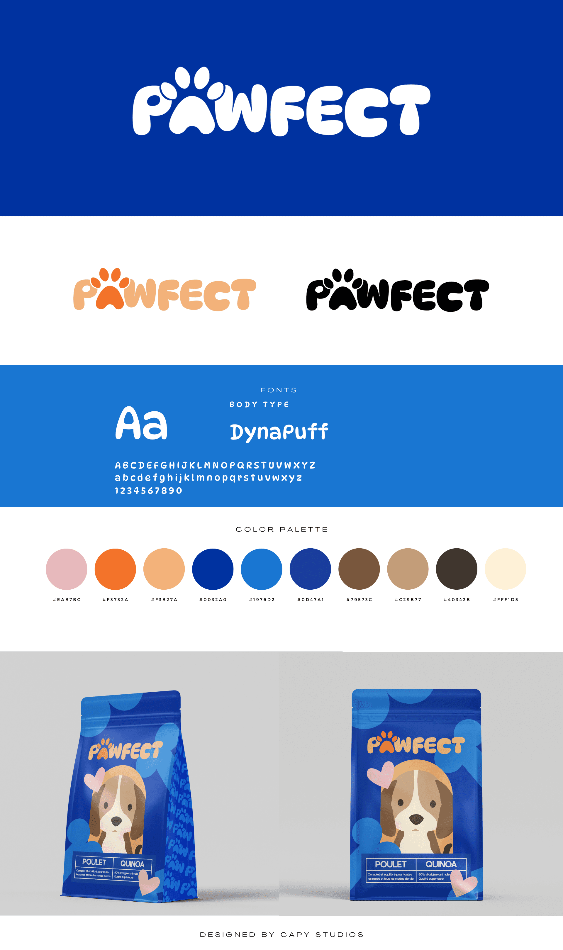 Pawfect est une marque de croquettes premium dédiée aux chiens, conçue pour offrir une alimentation équilibrée et savoureuse. Alliant ingrédients de haute qualité et expertise nutritionnelle, Pawfect met l’accent sur le bien-être animal tout en proposant un design ludique et moderne. Chaque détail, du logo au packaging, reflète un engagement envers les propriétaires soucieux de la santé et du bonheur de leur compagnon à quatre pattes.